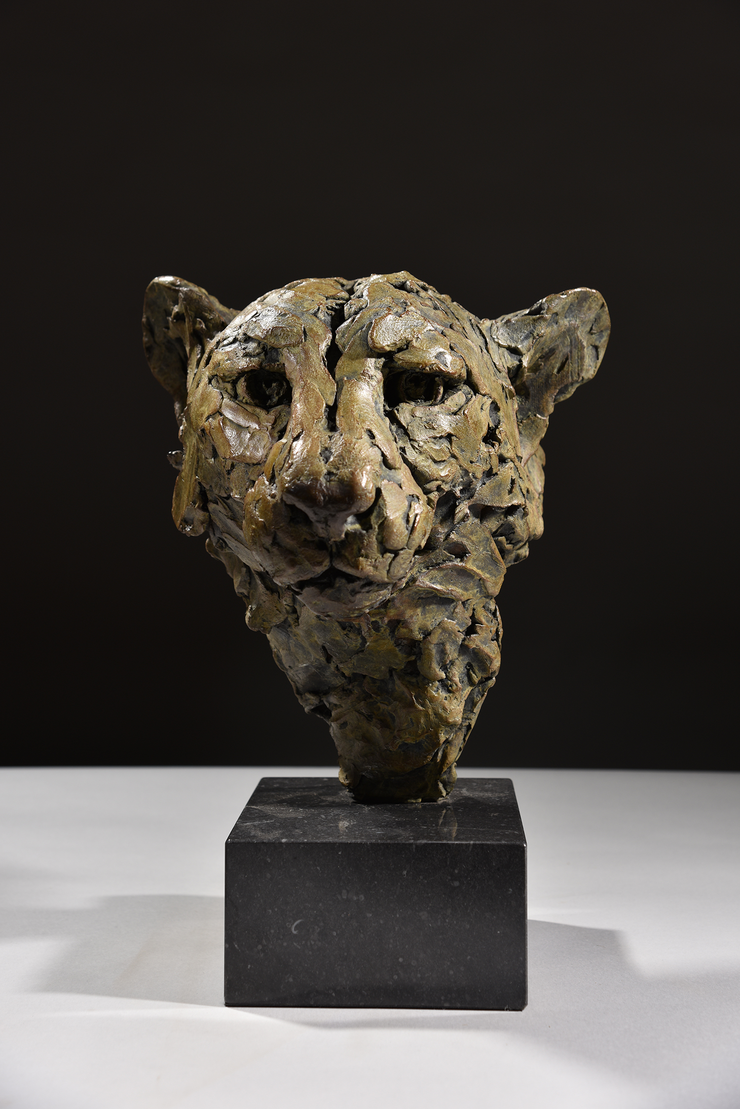 The cheetah heads were originally made in Plasticine, Clay and Mud and then cast into bronze. Hamish has worked in each medium many times before. However, until now he has not experimented with sculpting the identical subject and composition several times, each in a different material. It offered Hamish a greater comparative understanding of how each substance behaves and takes a patina, when all were cast into the same bronze.